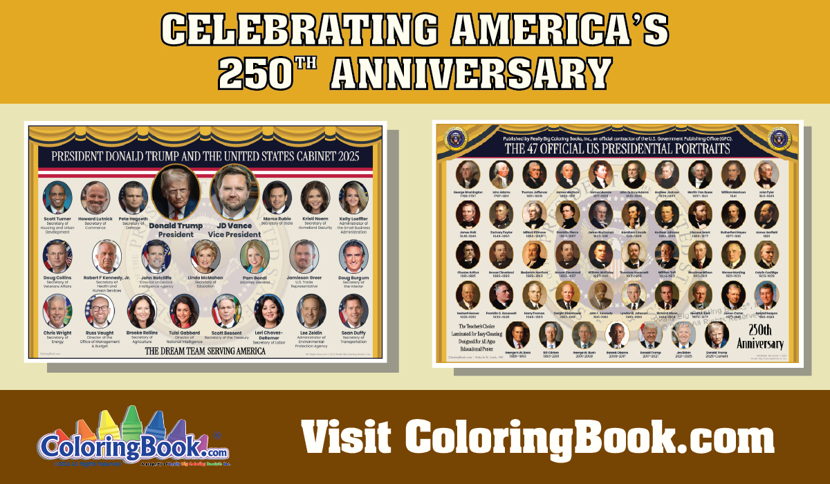 ColoringBook.com debuts America’s 250th Anniversary Posters, Notebooks, Coloring Books & Presidential Items
