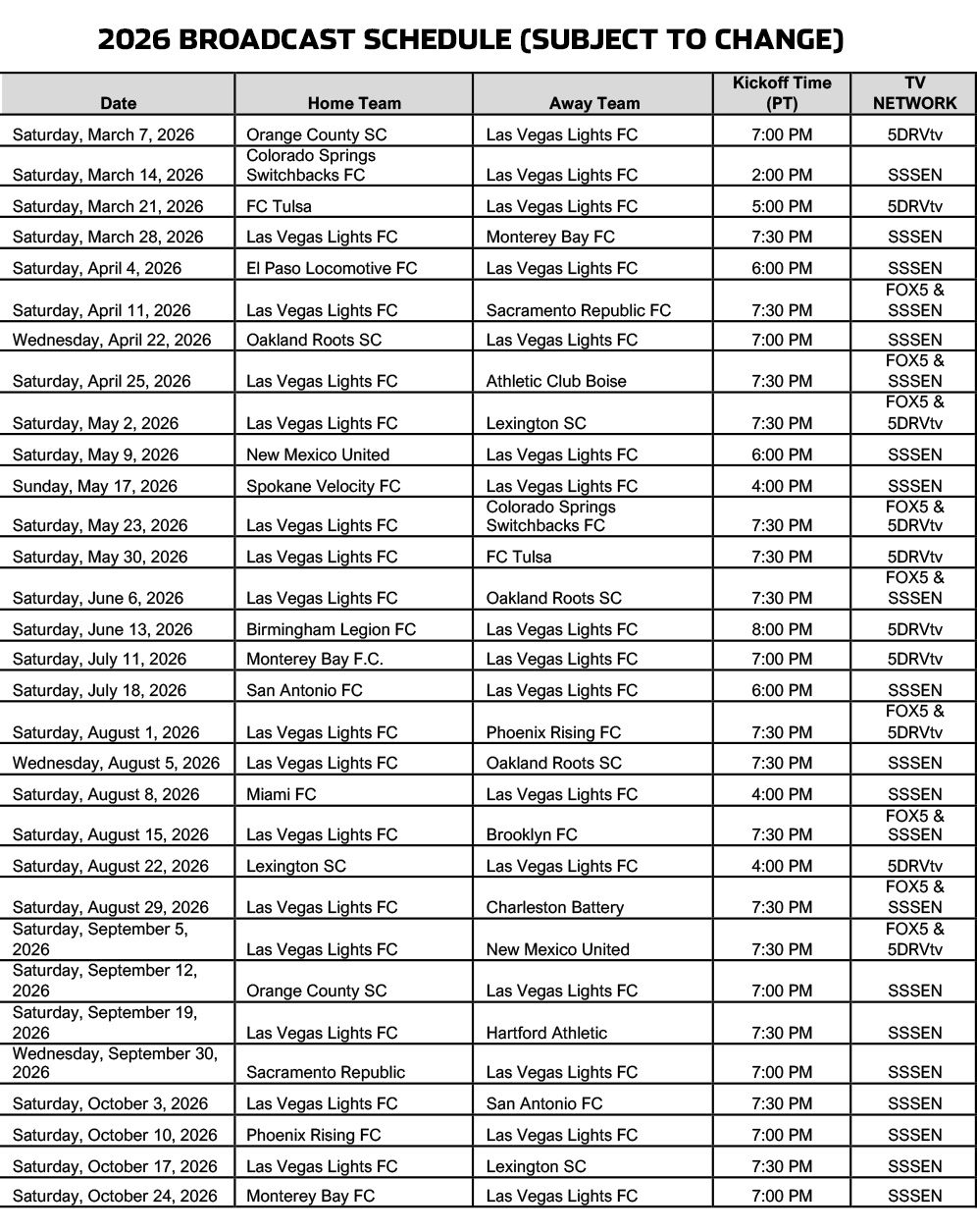 “This is a huge opportunity to introduce more people to the team we’re building and to keep winning over fans across the valley,” said Shawn McIntosh, CEO, Las Vegas Lights FC. “With FOX5 and SSSEN, Lights matches reach more living rooms, more new fans can experience the energy of game day, and our players get the exposure they’ve earned as we keep pushing to grow soccer in Las Vegas.”